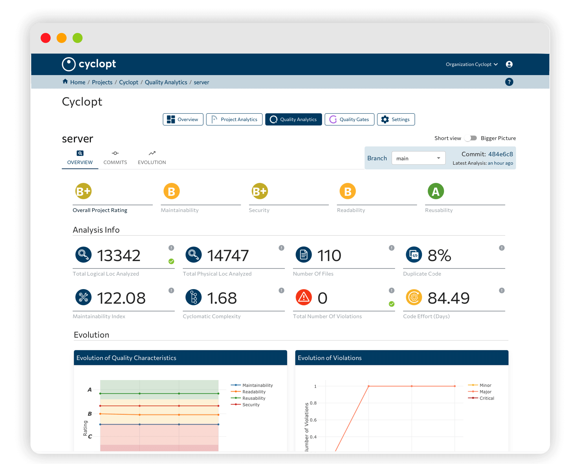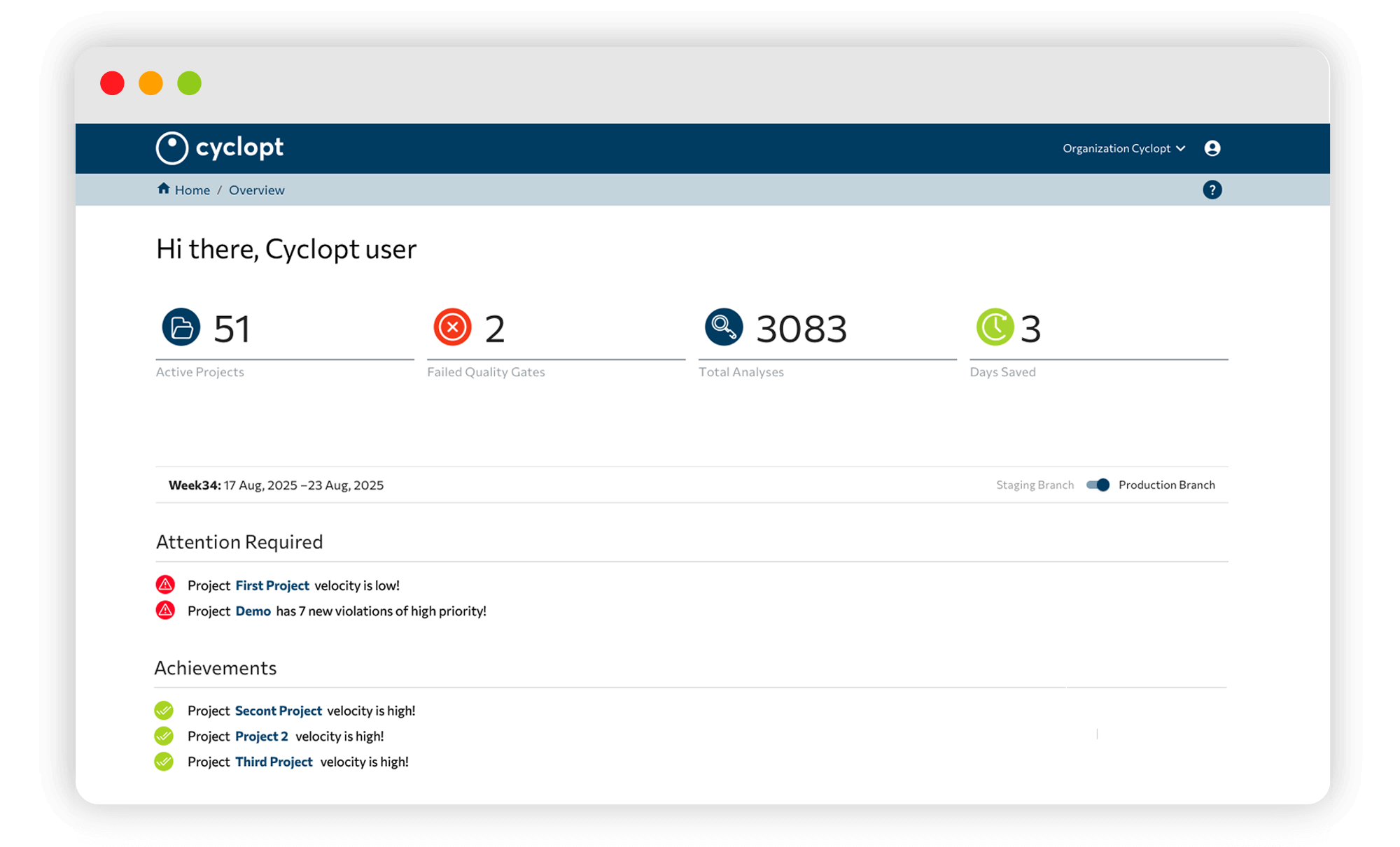 Cyclopt Panorama is a dashboard that gives team leaders full visibility into software quality across projects, teams, and developers. It tracks maintainability, security, code violations, duplication, and quality gate status on every commit, aligned with ISO/IEC 25010:2023. Whether the code is human-written or AI-generated, Panorama surfaces what matters before it reaches production.